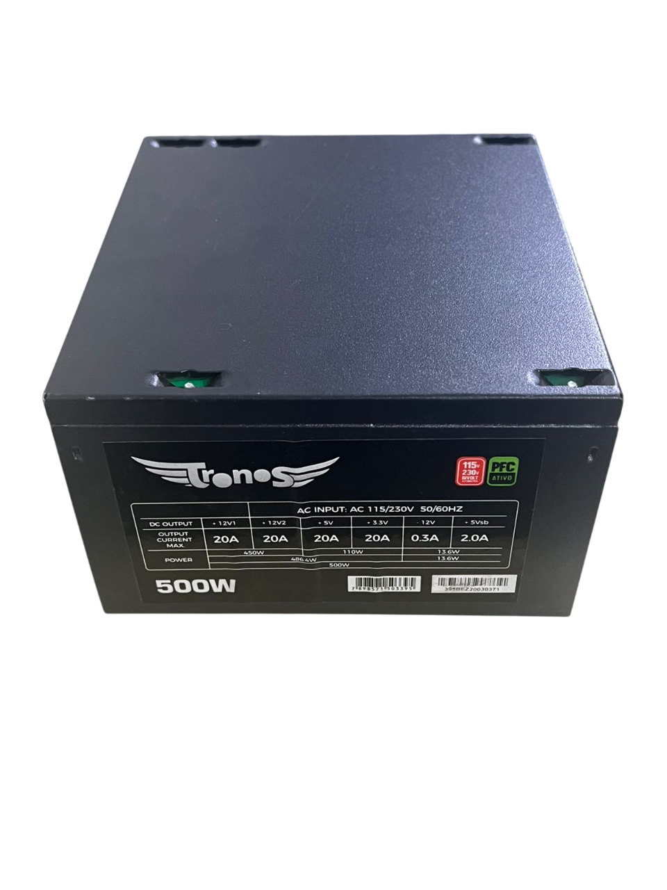 Fonte de alimentação ATX da marca Tronos com potência de 500W, na cor preta. Ideal para computadores desktop, garantindo alimentação estável para o sistema. Compatível com a maioria das placas-mãe e periféricos que utilizam padrão ATX.