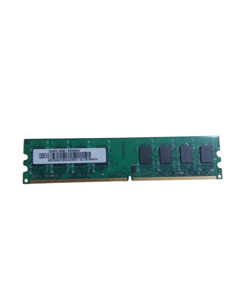 Memória RAM Qbex DDR2 de 2GB com frequência de 800MHz, ideal para reposição ou upgrade em computadores desktop compatíveis. Proporciona melhor desempenho e estabilidade para sistemas mais antigos que utilizam padrão DDR2.