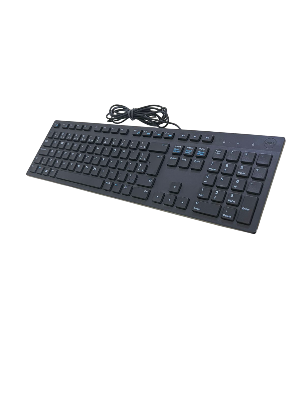 Teclado Dell com fio, modelo KB216t, padrão ABNT2 (Português Brasil), na cor preta. Possui design compacto e confortável, ideal para uso em escritórios, residências ou para reposição de teclados danificados. Conexão USB confiável e instalação simples.