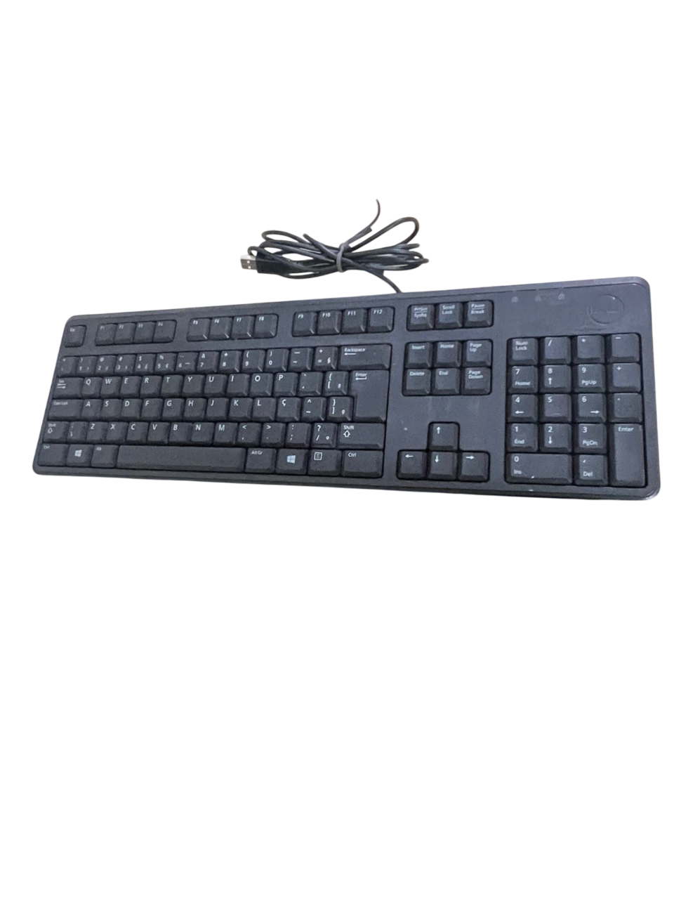 Teclado Dell modelo KB212-B, padrão ABNT2, com conexão USB. Conta com layout brasileiro completo, incluindo tecla Ç e todos os acentos, oferecendo praticidade no uso diário. Este teclado está em bom estado funcional, mas apresenta marcas de uso visíveis. As fotos do anúncio são reais do produto, garantindo transparência sobre sua condição. Compatível com desktops, notebooks e outros dispositivos com entrada USB.